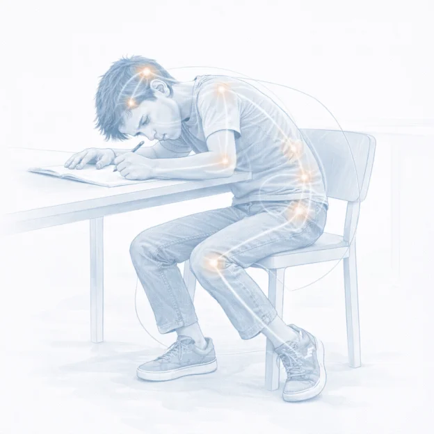 Der Schulalltag ist nicht nur geistig fordernd. Er verlangt auch langes Sitzen, anhaltende Blickfokussierung, wenig spontane Bewegung und eine stabile Haltung über viele Stunden. Wenn Gleichgewicht, Körperspannung oder Körperwahrnehmung nicht gut organisiert sind, kostet schon das ruhige Sitzen und Mitarbeiten unverhältnismäßig viel Energie.